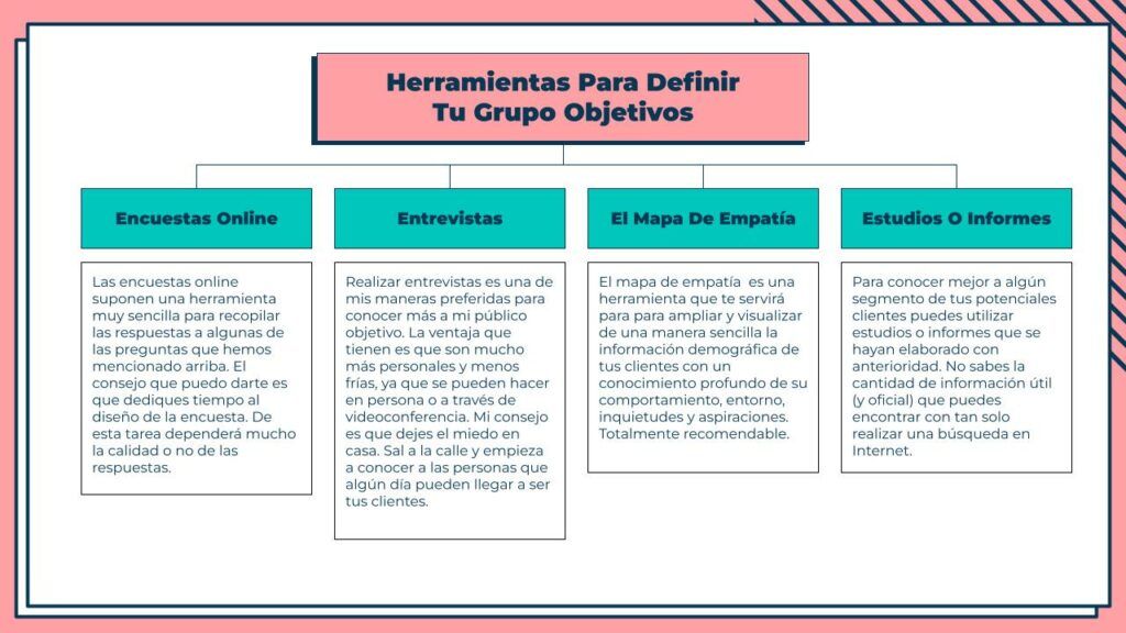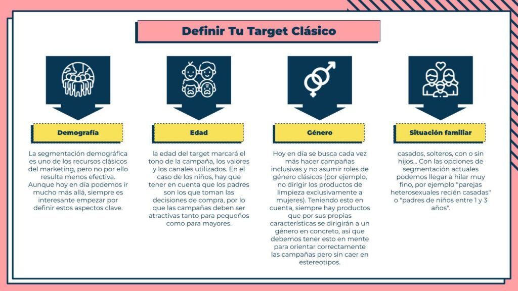 Es un recorte demográfico y conductual de un grupo de personas que la empresa elige como futuros clientes de tu producto o servicio. Es para ellos que las acciones de marketing se centrarán.